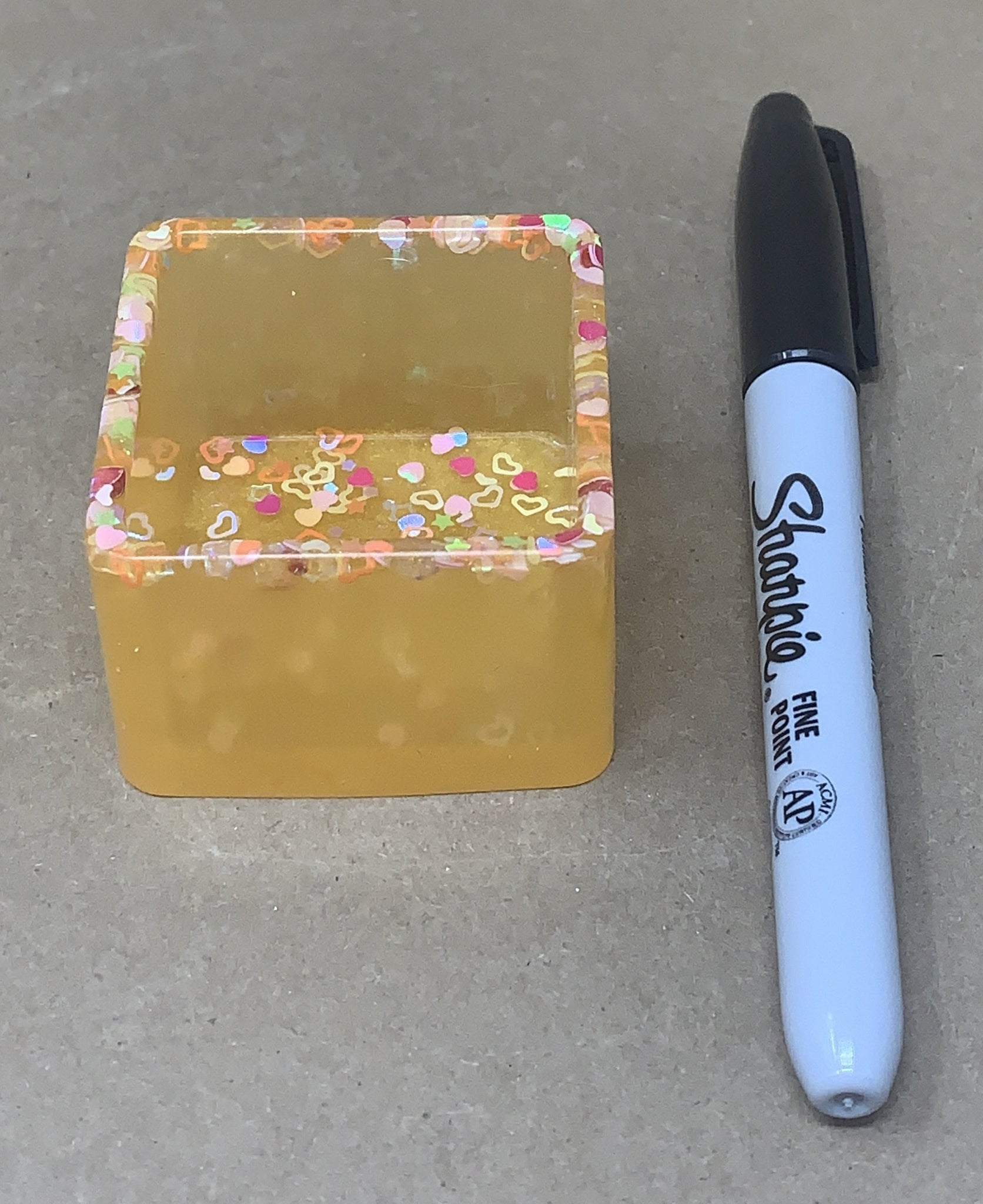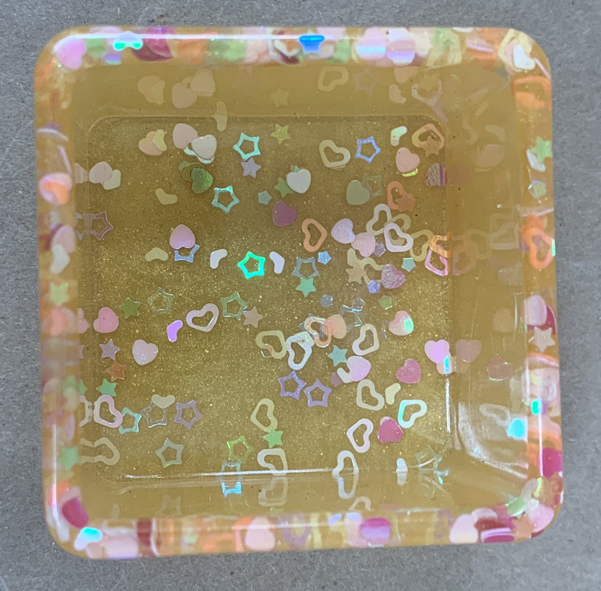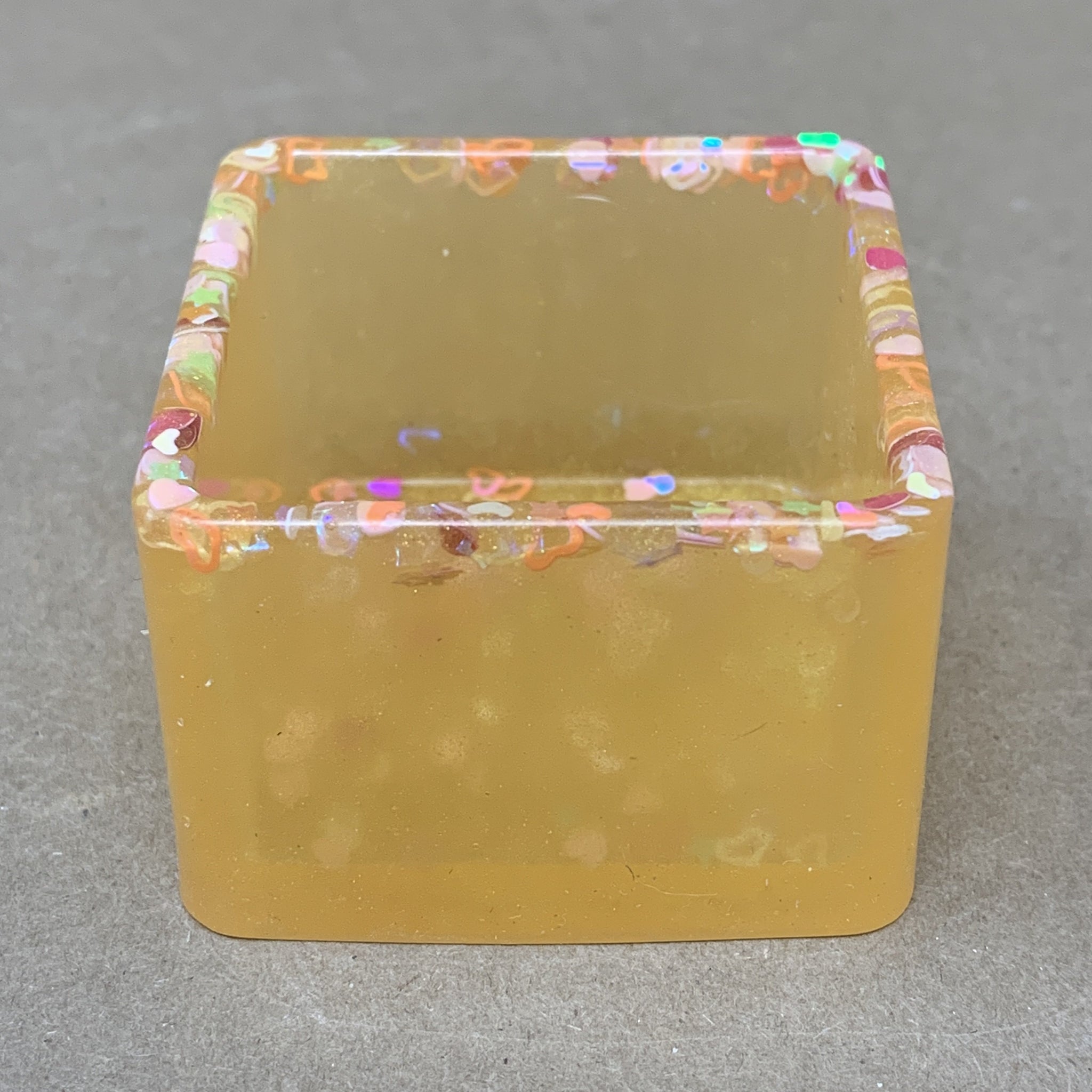 This 1.5” square pot is sunny and bright with a shimmery yellow base with chunky heart glitter. It's perfect for small plants, tiny cactus or cute little succulents for propagating! Ideal for small spaces like a desk or windowsill. Makes a great gift :)